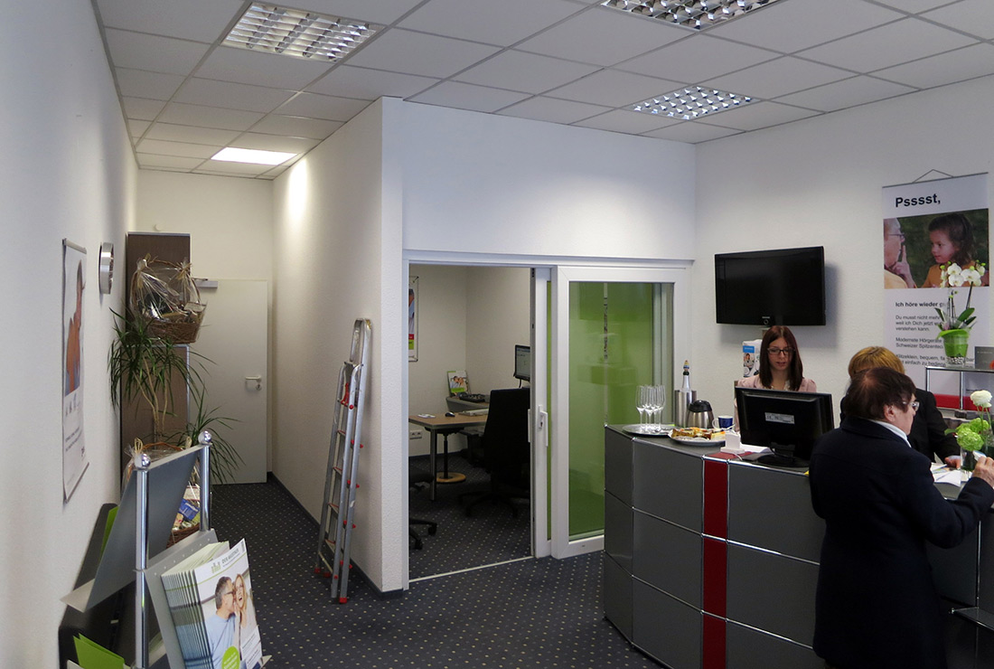 Der Verkaufsbereich lädt mit hellen und offenen Strukturen zum Betreten ein. Beratungsinseln in diskreter Atmosphäre zeugen von Kompetenz und Beratungsqualität der Hörakustiker. Die Präsentation der Hörsysteme erinnert nicht länger an medizinische Hilfen, sondern wandelt sich zu einer selbstbewussten Produktpräsentation. Ähnlich wie die Auslagen der Juweliere oder in Boutiquen, profitieren Hörsysteme von ihrem neuen Image. Die Vorbesprechung und Erstinformation erfolgt also in einer Umgebung, die zum Wohlfühlen einlädt.